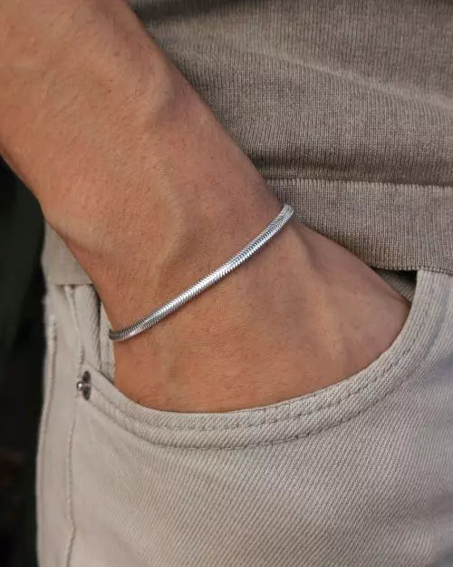 Com seu visual segmentado e acabamento espelhado, a Pulseira Scale, também conhecida como lacraia, é ideal para quem gosta de acessórios modernos, com identidade visual forte.